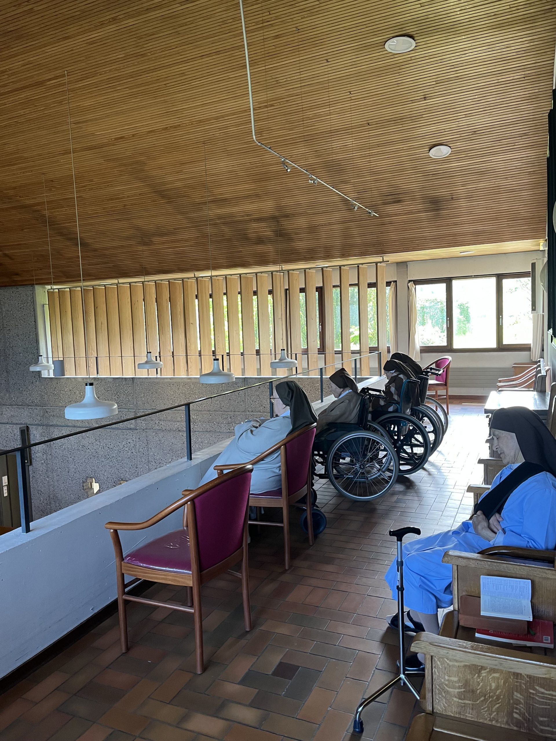 Les visitandines peuvent assister à la messe à la chapelle même si elles ont des difficultés à se déplacer. Le personnel soignant les aide à s'y rendre, assurant ainsi leur participation à la vie spirituelle de la communauté. Pour celles qui ne peuvent pas quitter leur chambre, la messe est diffusée par haut-parleurs, leur permettant de suivre les offices religieux.
